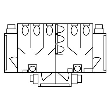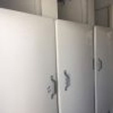 This unit is equipped with three private stalls. All three are equipped with standard toilet, freshwater sink, mirror, trash bin, and hands-free paper towel dispenser.
